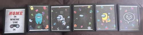 5 Framed wall art pieces of Among us video game. 1 framed wall art of “Home is where the [Nintendo game controller] is.